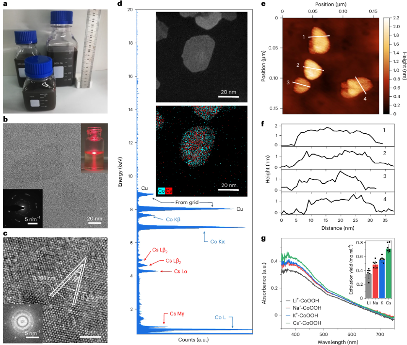 本研究以Co(OH)₂为模型体系,构建出一条基于拓扑化学氧化的剥离路径,成功实现了金属氧羟化物从体相到稳定水分散二维胶体的转化。以Cs⁺-CoOOH为代表,所得纳米片具备高结晶性、厚度约1.2 nm、横向尺寸约100 nm,并展现出良好的胶体稳定性和均匀分散特点。系统材料表征表明,活性氧物种(–OO·)的生成量与碱金属离子半径密切相关,Cs⁺体系表现出最高的剥离效率和电子结构调控能力。研究通过实验与理论结合,提出三重协同机制:其一,活性氧物种与碱金属阳离子的静电作用诱导层间膨胀;其二,H₂O₂分解所释放的O₂微泡提供物理解层推力;其三,Co³⁺/Co⁴⁺的氧化态调控促进–OO·物种形成,显著加速结构解离。理论计算结果进一步支持了该机制,证明了较大的碱阳离子增强了电子富集程度,使晶格氧更易形成O–O桥键,同时Co位点发生电子耗散,表现出过度氧化特征,与实验观测高度一致。