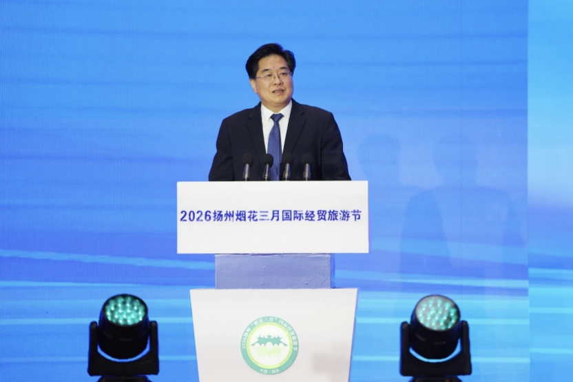 4月18日,2026扬州“烟花三月”国际经贸旅游节开幕式暨重大项目签约仪式在扬州市举行。扬州市委书记王进健在活动上致辞,扬州市委副书记、市长郑海涛作扬州经济社会发展推介,工口漫画 党委常委、副校长管海兵出席活动并讲话。